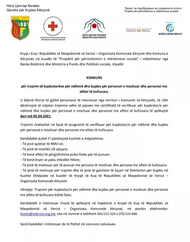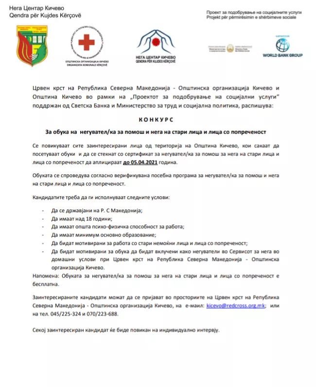 март 29, 2021Конкурс за обука на негувател/ка за помош на стари лица и лица со попреченост во Општина Кичево Konkurs për trajnim të kujdestarëve për ndihmë dhe kujdes për personat e moshuar dhe personat me aftësi të kufizuara < врати се назад